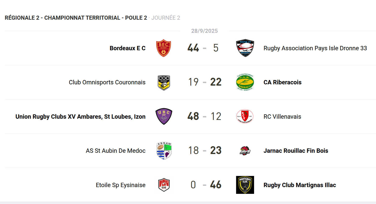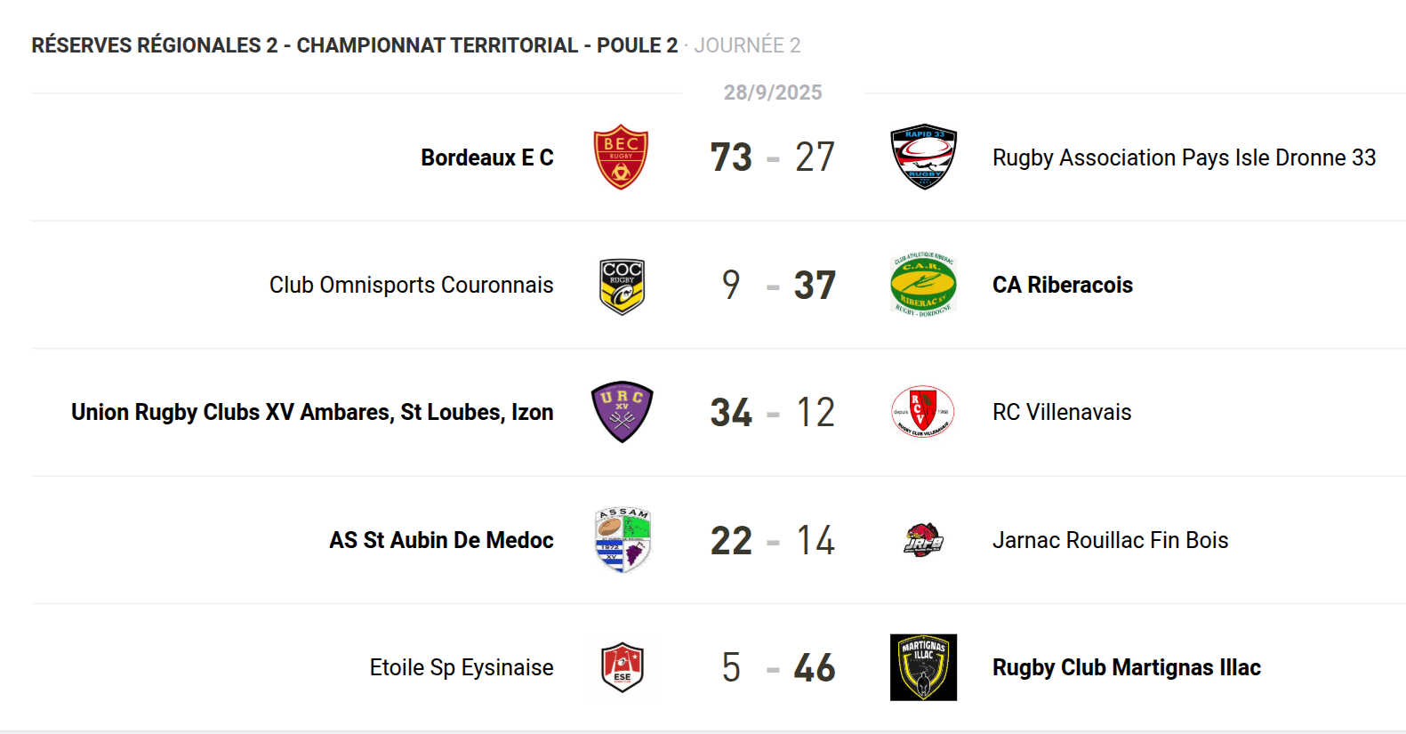 - Equipe Réserve: CA Ribérac 32 / URC XV 14